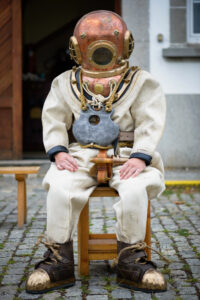 Tarpon Springs is a quaint town located near the Gulf shore of northwestern Florida with a distinct Greek heritage. For generations, strong Greek divers braved rip-tide currents and deep waters to harvest sponges – continuing their homeland legacy that gave them sustainable livelihoods within the United States. These ancestors wore heavy rubber dive suits with chunky metal helmets, and tethered by air hoses attached to oxygen supplies on the boats.