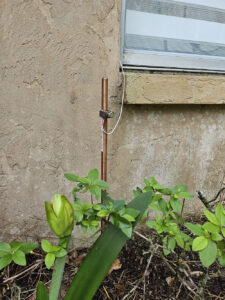 For our recently purchased grounding sheet interwoven with silver threads, Rob and I wanted a more direct Earthly grounding with a natural electron flow traveling by a copper pole buried from eight feet below ground and attached to a top wire snaked through the mortared side of our bedroom window to our grounding sheets (see photo above). Rob was able to make this conversion by modifying the electrical wire provided with the grounding sheet that we ordered. One lies directly on top of the bottom sheet to sleep.