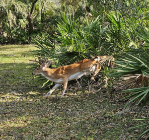 March 13, 2025 – The AquaNew Ranch is adjacent to over 300,000 acres of wilderness preserves and conservation easements that are called in its entirety “the Myakka Island”. It is a green paradise except nutritious food stuffs for the grazing mammals are limited. Sarasota, FL. is in a sub-tropical zone where the diversity of plants are limited due to the extreme temperature variances throughout the year (colder winters and hotter summers) when compared to the zones either in the South or in the North, respectively. Corn is a limited spring-time only crop and the oak trees drop their acorns in the fall. Deer mainly feed on grass and other herbaceous plants. The white-tail deer in our backyard are smaller than the ones to the North that have more access to corn fields. Recently, we have had a pack of considerably smaller white-tail deer and one Park Ranger theorize that has resulted from decades of malnutrition. They are definitely spunky getting their place at the feed buckets and do not hesitate to move the larger deer out of the way. I guess size does not hinder the innate drive for survival.